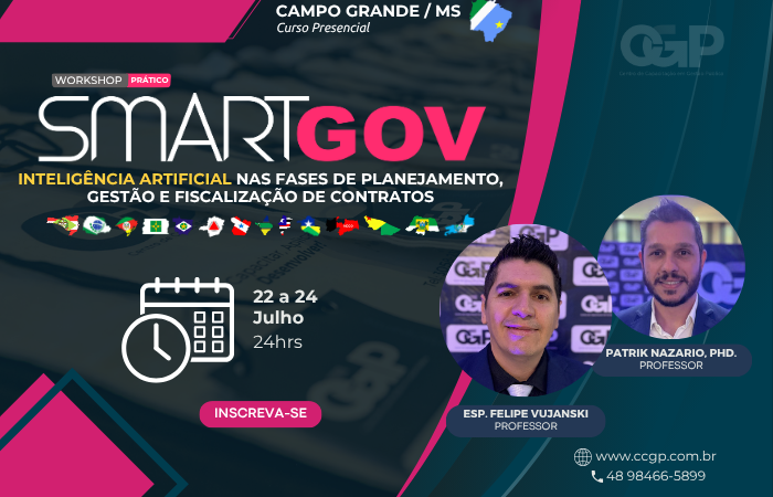 22 a 24/07 – Campo Grande / MS Esp. Felipe Vujanski | Patrik Nazario, PhD. O maior e mais completo Workshop Prático sobre o uso da Inteligência Artificial aplicada na fase de planejamento das contratações (DFD, ETP e TR), na gestão de contratos e nas rotinas de fiscalização de contratos administrativos.