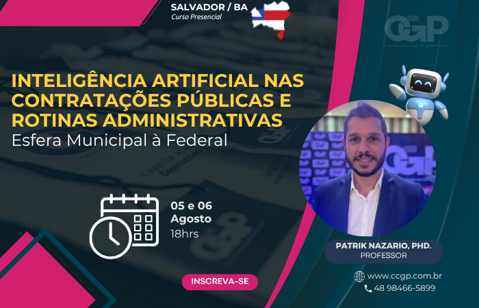 05 e 06/08 – Salvador / BA Patrik Nazario, PhD. Aprenda de maneira prática e alinhada às suas demandas como utilizar a Inteligência Artificial no seu dia a dia. Descubra como agilizar as rotinas administrativas, a elaborar documentos do planejamento das contratações (DFD, ETP, TR), fazer análise em instantes de documentos oficiais (PDF, Txt, Sites, […]