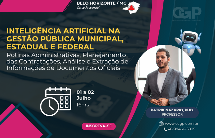 01 a 02/07 – Belo Horizonte / MG Patrik Nazario, PhD. Aprenda de maneira prática e alinhada às suas demandas como utilizar a Inteligência Artificial no seu dia a dia. Descubra como agilizar as rotinas administrativas, a elaborar documentos do planejamento das contratações (DFD, ETP, TR), fazer análise em instantes de documentos oficiais (PDF, Txt, […]